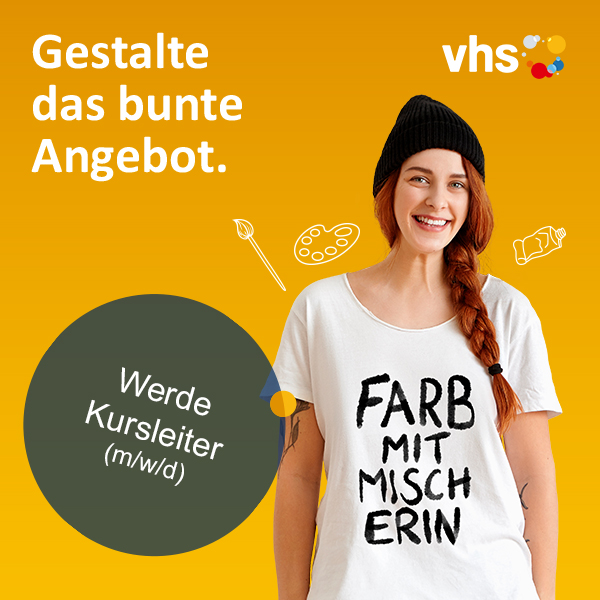 Es erwartet Sie ein unterstützendes und sympathisches vhs-Team sowie aufgeschlossene und motivierte Kursteilnehmende in freundlicher Umgebung. Unsere Kursleitenden arbeiten auf Honorarbasis.