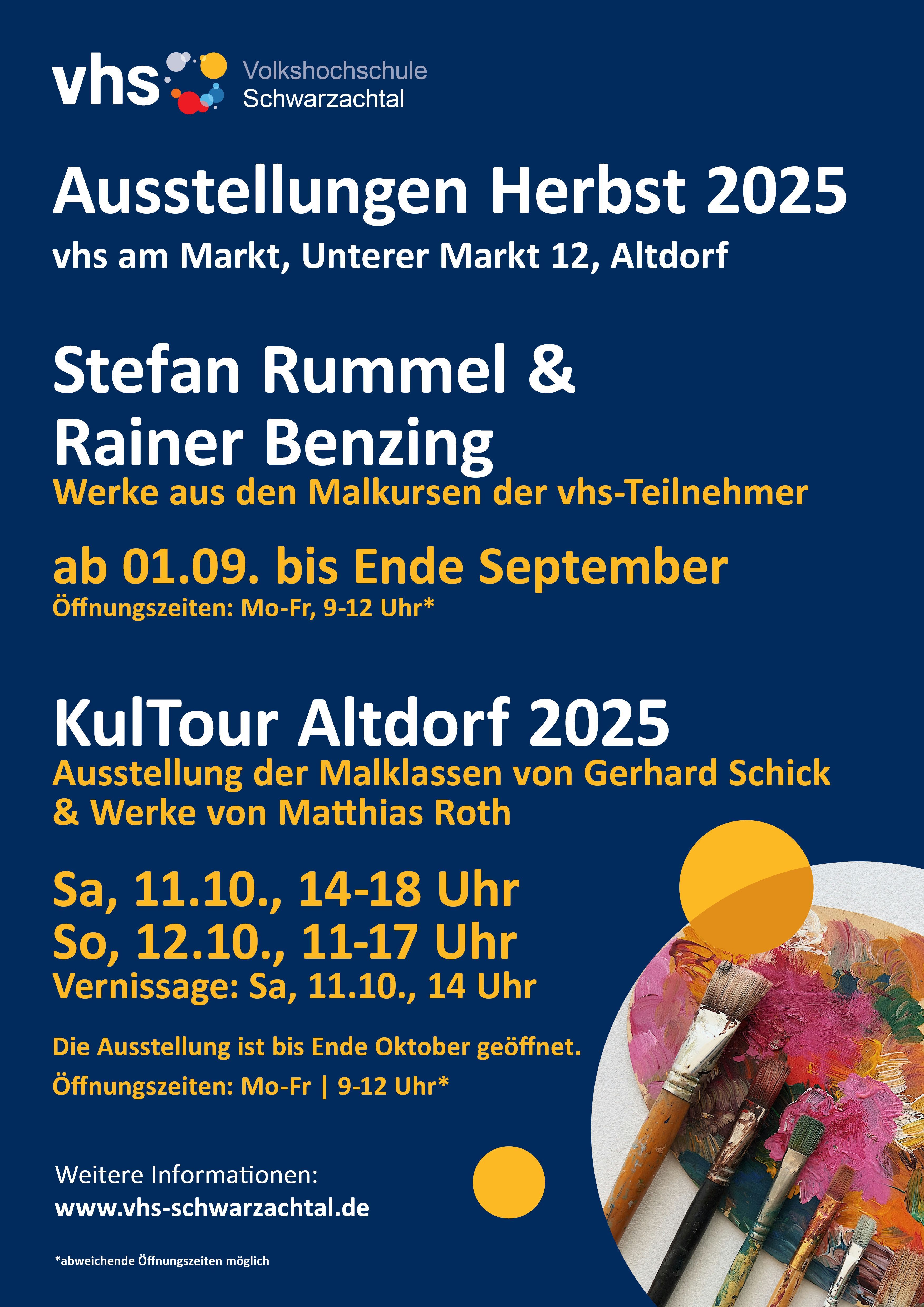 Die Ausstellung im Rahmen der KulTour 2025 in den Räumen der vhs Schwarzachtal bietet einen umfassenden Einblick in verschiedenste Techniken der Mal- und Zeichenkunst. Teilnehmende der vhs-Kurse präsentieren ihre persönlichen Malereien und Zeichnungen, die im Rahmen von vhs-Kunstkursen entstanden sind. Geleitet werden diese von Gerhard Schick, einem in Altdorf lebenden akademischen Maler und Dozenten der Akademie Faber-Castell.
