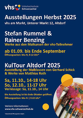 Im Rahmen der KulTour 2025 folgt ab Sa, 11.10. eine zweite Ausstellung mit Vernissage am Sa, 11.10. um 14 Uhr. Sie zeigt Malereien und Zeichnungen weiterer vhs-Kursteilnehmenden und ist bis Ende Oktober zu sehen.