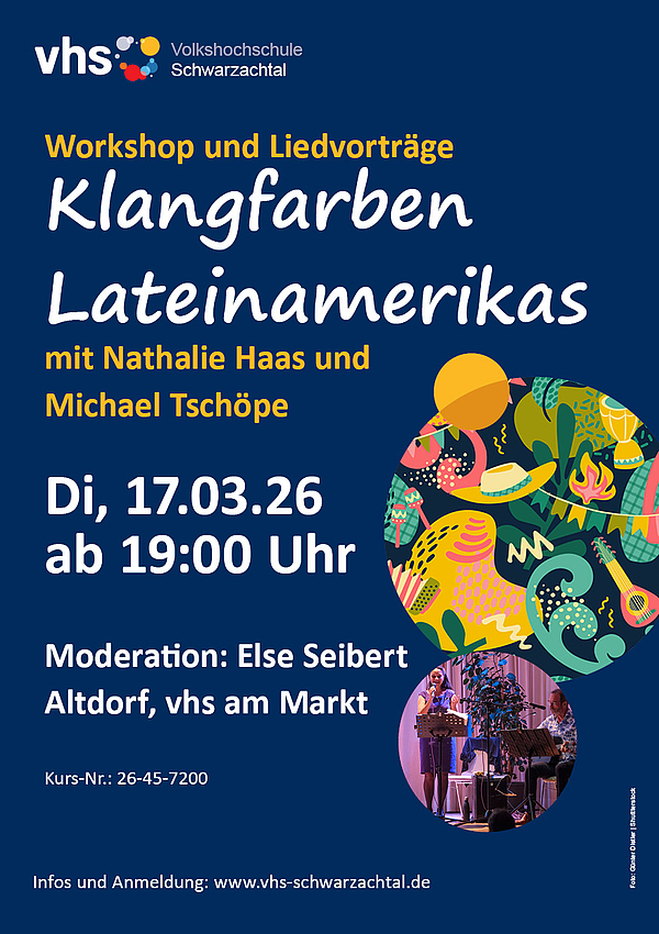 Erleben Sie am Di, 17.03.26, in der vhs am Markt in Altdorf einen Abend voller Lebensfreude, berührender Volkslieder und schwungvoller Rhythmen. Mit Musik, Geschichten und spannenden Einblicken in Bräuche, Legenden, Handwerkskunst und Sprache(n) wird lateinamerikanische Folklore lebendig.
